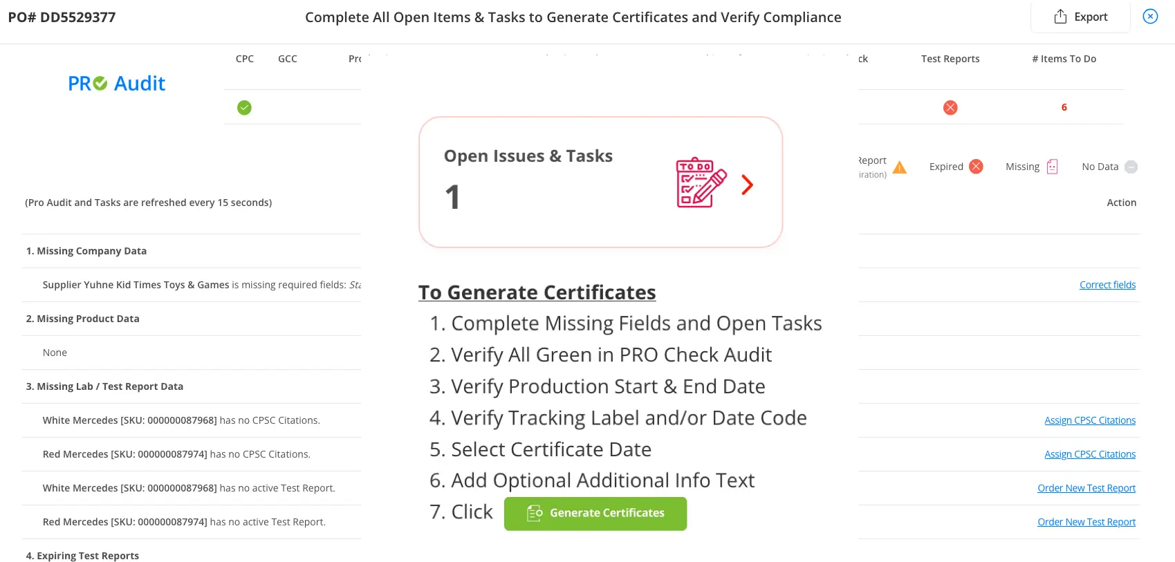 Comply PRO+ automates data collection & checks your data against requirements every 15 seconds, generates certificates for every product on every shipment, with one-click filing directly to the CPSC product registry.