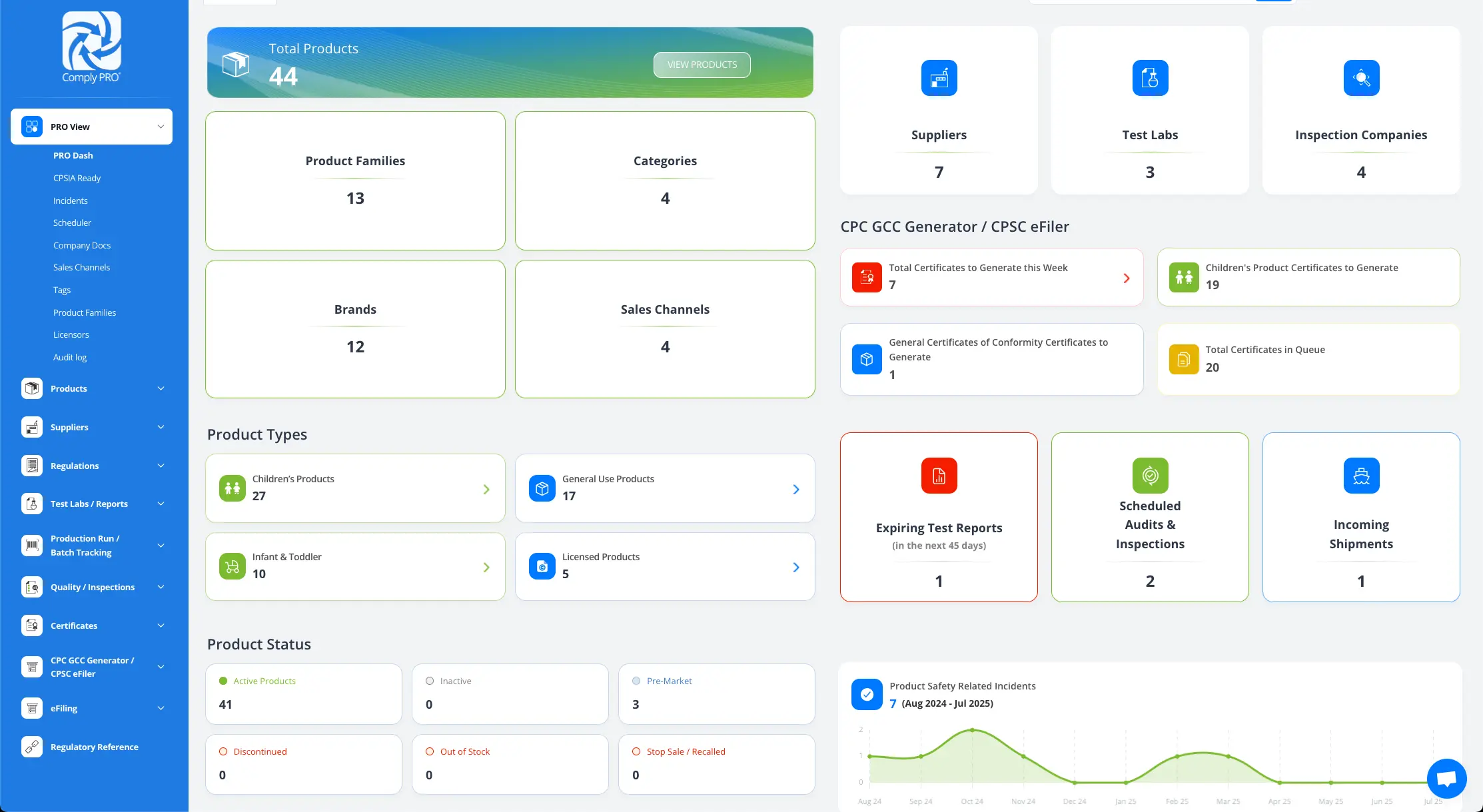 Comply PRO+ has revolutionized product safety compliance tracking. With its visionary leadership and groundbreaking software, it is redefining industry standards and making compliance management more accessible and effective than ever before! The CPC Generator represents another milestone. This innovative feature simplifies CPC creation and prepares me for CPSC eFiling. ComplyProPlus offers unparalleled ease of use and efficiency with an optional API to Quickbooks or other accounting programs.