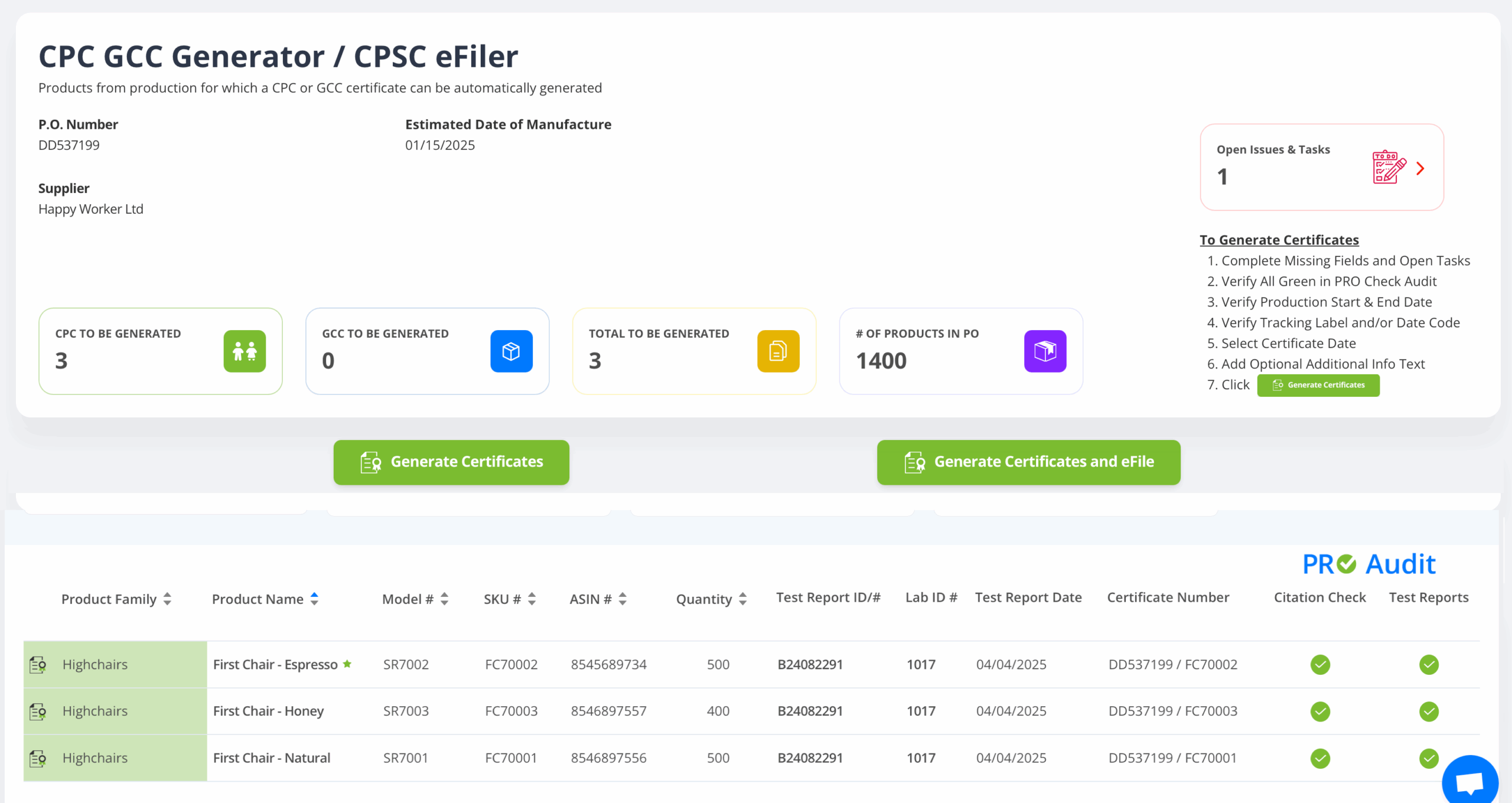 - Automated Certificate Generation: Instantly creates Children’s Product Certificates (CPCs), General Certificates of Conformity (GCCs), and other required documents from laboratory test reports, which eliminates manual data entry and reduces errors.