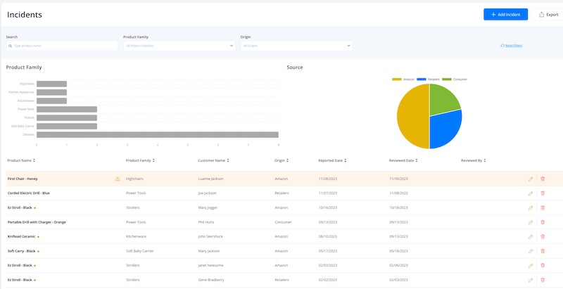 Incidents can come from many sources, and once entered, you can see incidents by Product Family and Origin. See trends and identify issues that must be immediately corrected to minimize your exposure to a possible recall.